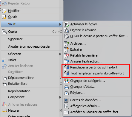 A l'aide des commandes Remplacer à partir du coffre-fort et Tout remplacer à partir du coffre-fort, vous pouvez accéder directement à Vault, rechercher les composants requis et effectuer les remplacements.