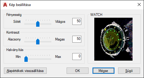 A kijelölt kép megjelenítését vezérli a fényesség, kontraszt és fakultság értékeinek beállításával.