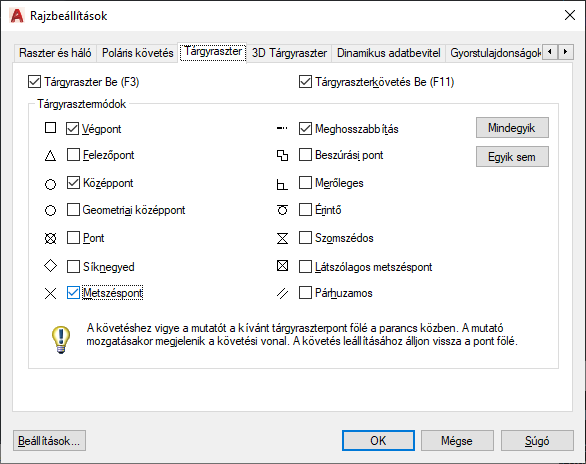 A futó traszternek is nevezett futó tárgyraszter beállításokkal egy pontot adhat meg az objektum egy bizonyos helyén. Nyomja le a TAB billentyűt a beállítások közötti lépkedéshez.