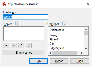 Megjeleníti a kiemelt rajzadatok és külső adatok (ha van adatkapcsolat) oszlopainak nevét. Ha duplán kattint az oszlop nevére, akkor az bekerül a Képlet mezőbe, de az oszlop nevét az Oszlop listáról is behúzhatja a Képlet mezőbe. A meglévő képlet oszlopok nincsenek felsorolva, és nem lehetnek más, újonnan készített képlet oszlopok értékei.