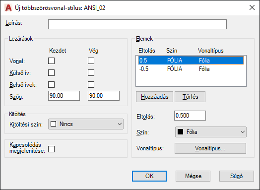 Új elemet ad a többszörösvonal-stílushoz. Nem érhető el, amíg egy STANDARD-tól különböző szín vagy vonaltípus ki nem lett választva egy többszörösvonal-stílushoz.