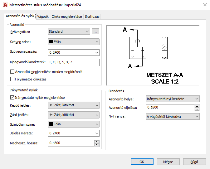 Azonosító és nyilak lap (Metszetinézetstílus-kezelő)