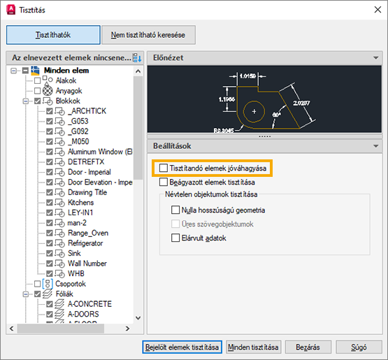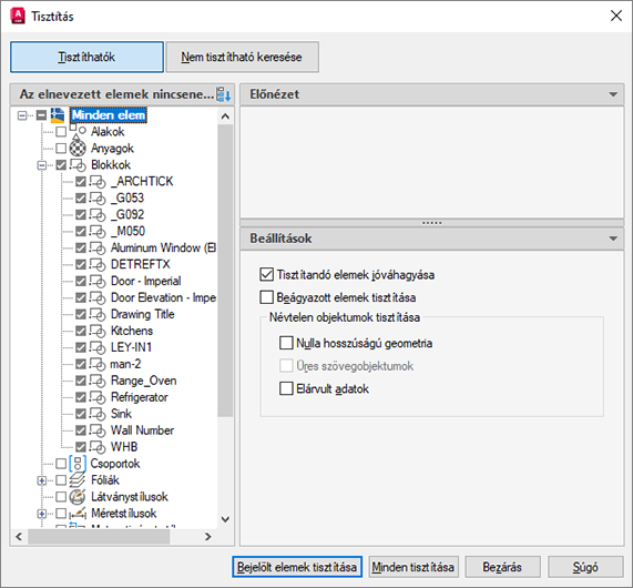 A Tisztítás parancs eltávolítja a rajzból a nem használt elemeket vagy az elnevezett objektumokat, például a blokkdefiníciókat és a fóliákat.