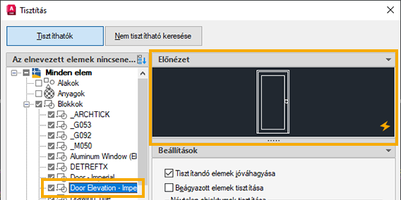 Lehet, hogy tisztítani szeretne egy elemet, de az nem jelenik meg a Nem használt elnevezett elemek listáján. A Nem tisztítható elemek keresése listán megtekintheti azokat az elnevezett elemeket, amelyek használatban vannak a rajzban.