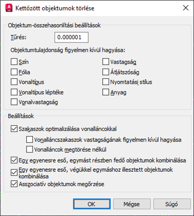 Alapértelmezés szerint az OVERKILL parancs nem működik a megkülönböztető tulajdonságokkal rendelkező objektumokon. Ha például az objektumok megegyeznek, de egy másik fólián találhatók, vagy eltérő vonalvastagsággal rendelkeznek, akkor a program nem tekinti azokat ismétlődőknek. Azonban módosíthatja a beállításokat, hogy a program bizonyos tulajdonságokat figyelmen kívül hagyjon.