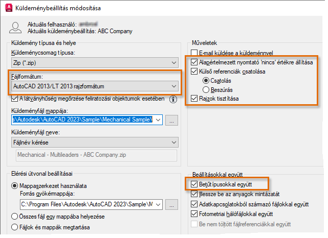 A Szabványos küldeménybeállítás jó kiindulási pont, de létrehozhatja saját küldeménybeállításait attól függően, hogyan történik a rajzfájlok megosztása a vállalaton kívüli felekkel. Ha például egy korábbi AutoCAD-kiadást használó ügyféllel vagy alvállalkozóval dolgozik, megadhat egy olyan küldeménybeállítást, amely minden rajzot egy adott DWG fájlformátumban ment, és az alapértelmezett nyomtatót Nincs értékre állítja.