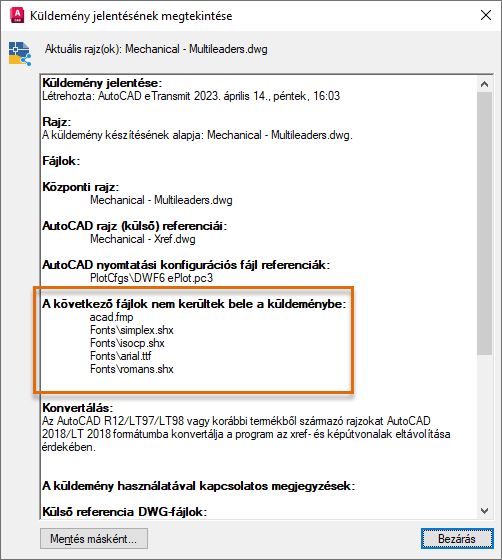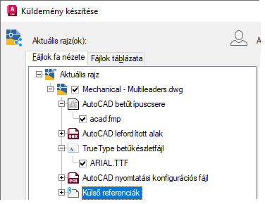 Figyelje meg a Fájlok fa nézete módosításait, a rajzban használt betűtípusokhoz kapcsolódó fájlok mostantól a küldeménycsomag részét képezik.