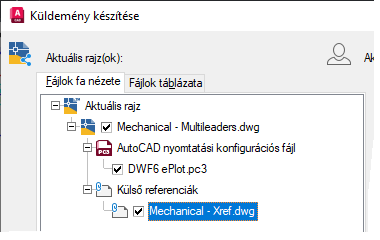 Az e-Küldemény szolgáltatás használata során a program az aktuális rajzban hivatkozott fájlokat keres, ezek a fájlok pedig a Küldemény készítése párbeszédpanelen jelennek meg.