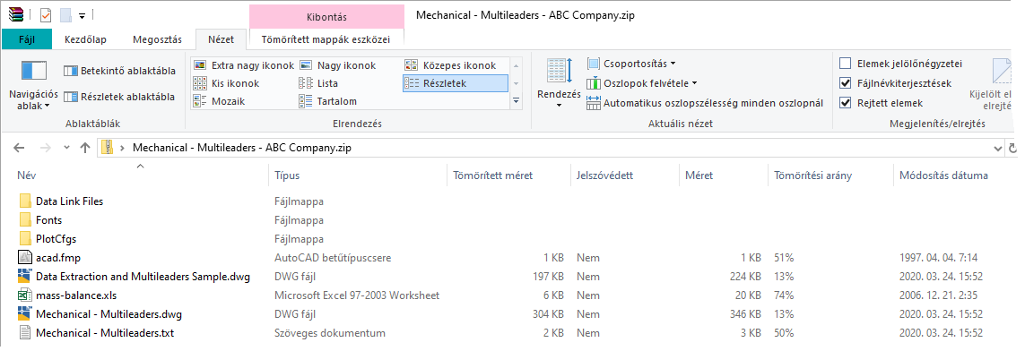 A Ctrl billentyű nyomva tartása mellett jelölje ki a Data Extraction and Multileaders Sample.dwg és a mass-balance.xls fájlokat. Kattintson a Megnyitás gombra.