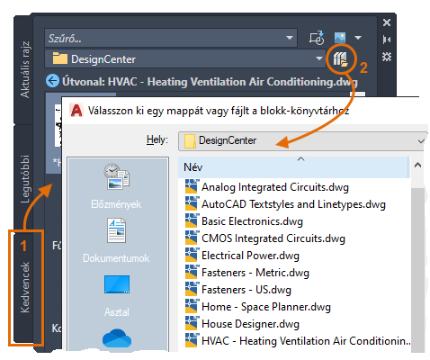 - Ha egy másik könyvtárbeli rajzot szeretne választani a DesignCenter mappából, győződjön meg arról, hogy biztosan a Könyvtár lap van-e megnyitva (1), majd kattintson a fájlnavigációs gombra (2).