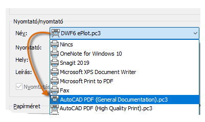 A Nyomtató legördülő listából válassza az AutoCAD PDF (General Documentation).pc3 lehetőséget: