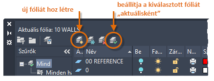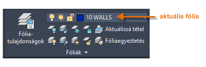 Ahogy azt láthatja az illusztráción, a 10 WALLS az aktuális fólia. A rendszer az összes új fóliát automatikusan erre a fóliára helyezi el. A fóliák listájában a 10 WALLS fólia mellett található zöld pipa jelzi, hogy ez az aktuális fólia.