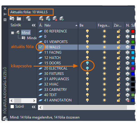 A Be feliratú oszlopban látható, hogy két fóliánál sötét a villanykörte ikon. Ezek a fóliák azért vannak kikapcsolva, hogy elrejtsék az alaprajzon található ajtókat és elektromos vezetékeket.