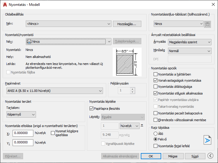 Rajzi elrendezés küldése egy nyomtatónak, egy plotternek vagy egy fájlba. A nyomtató beállításainak mentése és visszaállítása az összes elrendezéshez.