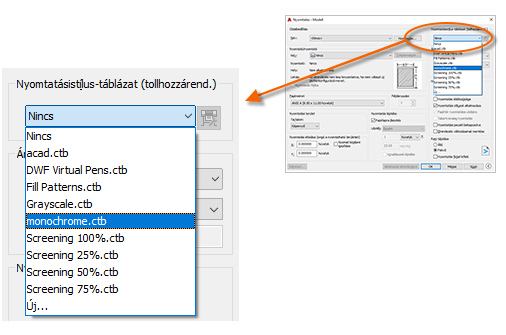 A nyomtatásistílus-táblázat információkat biztosít a színek feldolgozásáról. A monitoron szépen megjelenő színek nem feltétlenül megfelelőek egy PDF-fájlhoz vagy nyomtatáshoz. Például létrehozhatja a rajzot színesen, de a kimenetet beállíthatja monokrómra. A következő módon adhatja meg a monokróm kimenetet: