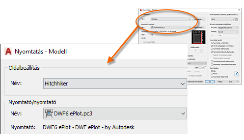Ha készen áll a nyomtatásra, egyszerűen adja meg az oldalbeállítás nevét a Nyomtatás párbeszédpanelen, amellyel visszaállítja az összes nyomtatási beállítást. A következő illusztráción a Nyomtatás párbeszédpanelen az Útikalauz stopposoknak oldalbeállítás használata van beállítva, amely egy DWF (Design Web Format) fájlt fog létrehozni a nyomtatás helyett.