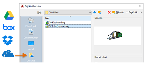 Ha rendelkezik fiókkal valamelyik felhőtárhely-szolgáltatónál, hozzáadhatja azt a Helyek sávhoz az AutoCAD fájlkiválasztó párbeszédpanelein, hogy közvetlenül elérhesse a felhőtárhelyfiókban lévő rajzokat. Egyszerűen kattintson a jobb gombbal a Helyek sávon, és adja meg a navigációs parancsikon nevét és elérési útvonalát.