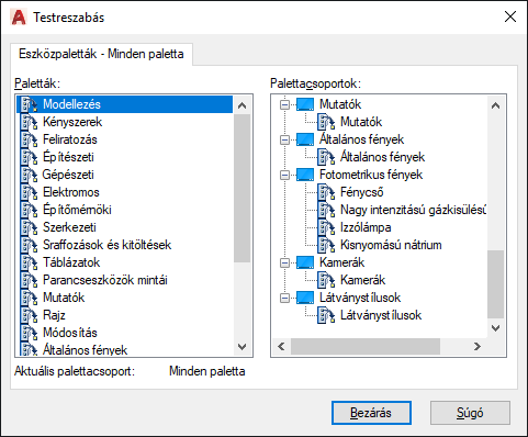 Megjeleníti az eszközpaletta-csoportok és az azokban található eszközpaletták fanézetét.