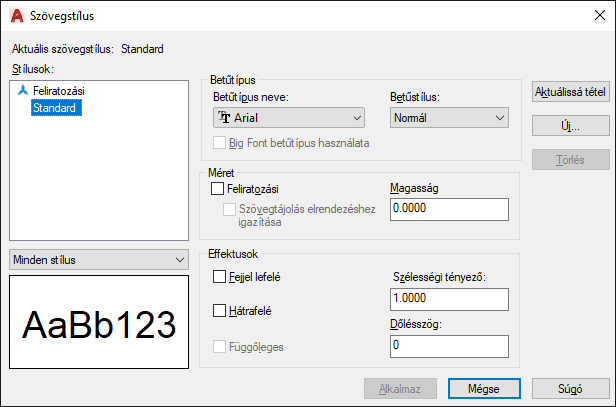 A párbeszédpanelen történő stílusváltoztatást a rajzban az aktuális stílusra és az aktuális stílusú szövegre alkalmazza.