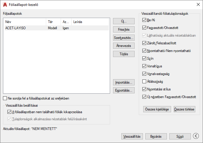 A kiválasztott fóliaállapotot a fóliatulajdonságok felülírásaként alkalmazza a program az aktuális elrendezési nézetablakra. Ez az opció akkor érhető el, ha aktuális elrendezés nézetablak esetén indítja el a Fóliaállapot-kezelőt.