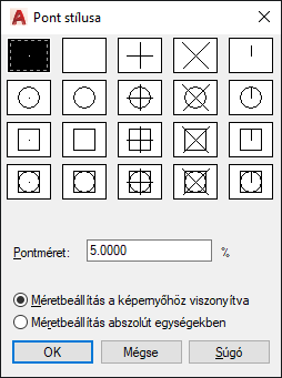 Beállítja a pont megjelenítési méretét. Az értékek lehetnek a képernyőhöz viszonyítottak vagy abszolút egységekben megadottak is. A pont megjelenítési méretét a PDSIZE rendszerváltozó tárolja. Az ezután megrajzolt objektumok az új értéket használják.
