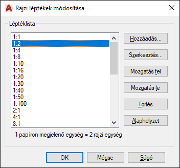 Az aktuálisan definiált léptékek listáját jeleníti meg. Az xrefek csatolásakor importált ideiglenes léptékek is megjelennek. Ha egy léptéknév megismétlődik, de értéke más, a név kiegészül egy számmal.
