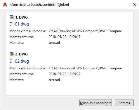 Ez a parancs egy párbeszédpanelt jeleníti meg, amely két összehasonlított rajzfájllal kapcsolatos információkat tartalmaz. A beállításokkal táblázatobjektumot hozhat létre ezekből az információkból, vagy a Vágólapra másolhatja azokat.
