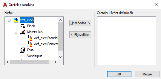 Áthelyezi az xref listában kijelölt elnevezett objektumok definícióját a Csatolni kívánt definíciók listába.