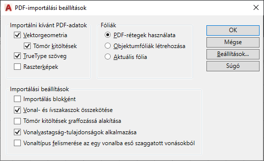 Megadja egy adott PDF-fájlból származó geometria, kitöltések, raszterképek és TrueType szövegobjektumok importálási beállításait.