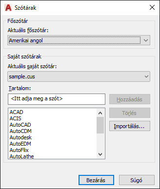Az aktuális saját szótár nevét jeleníti meg. AzAutoCAD-ben a saját szótárak kiterjesztése .cus.