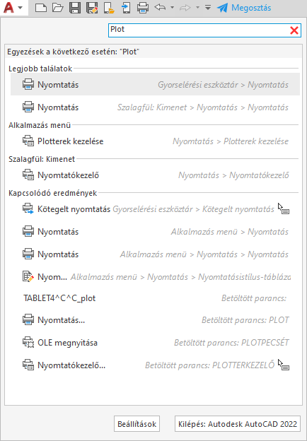 A parancskeresési mező az alkalmazásmenü tetején jelenik meg. A találatok között menüparancsok, alapvető eszköztippek és szöveges parancssori karakterláncok szerepelhetnek. A keresőkifejezést bármilyen nyelven megadhatja. Az eredmények az aktuális munkaterületre vonatkoznak.