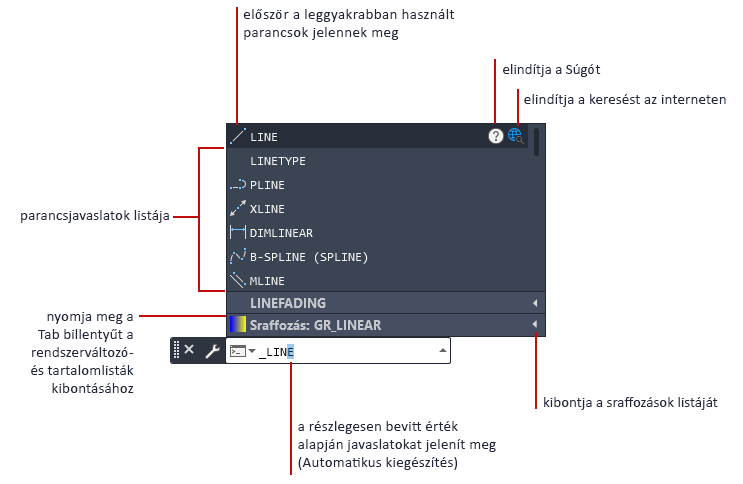 A javasolt parancsok listája megjelenik, amint megadja a parancs első néhány betűjét akár a parancsablakban, akár a dinamikus adatbeviteli mezőben. Alapértelmezés szerint a lista a következő jellemzőkkel rendelkezik: