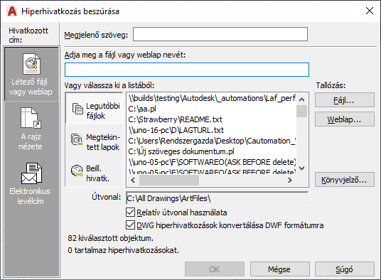 Relatív útvonalat alkalmaz a hiperhivatkozásokhoz. Ha az opció be van jelölve, a program a csatolt fájlhoz tartozó teljes elérési útvonalat nem menti a hiperhivatkozással. A relatív elérési útvonalat a rendszer a HYPERLINKBASE rendszerváltozó által megadott értékűre állítja be, vagy ha a HYPERLINKBASE rendszerváltozó értéke nincs megadva, akkor az aktuális rajz elérési útvonalára. Ha törli az opciót, a program a hozzárendelt fájlhoz tartozó teljes elérési útvonalat menti, a hiperhivatkozással együtt.