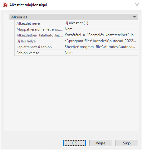 Megadja azt a rajzsablonfájlt (DWT) és elrendezésnevet, amelyet ebben az alkészletben az új rajzfájlok létrehozásához használunk.