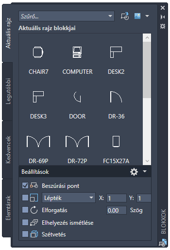 Tipp: Létrehozhat olyan „blokk-könyvtár rajzokat”, amelyek az összes kapcsolódó blokk-definíciót tartalmazzák. Ennek a módszernek a használata esetén válassza a palettán a Szétvetés beállítást a blokk-könyvtár rajz beszúrásakor, így maga a rajz nem jelenik meg az előnézet területen sem képként, sem listában.