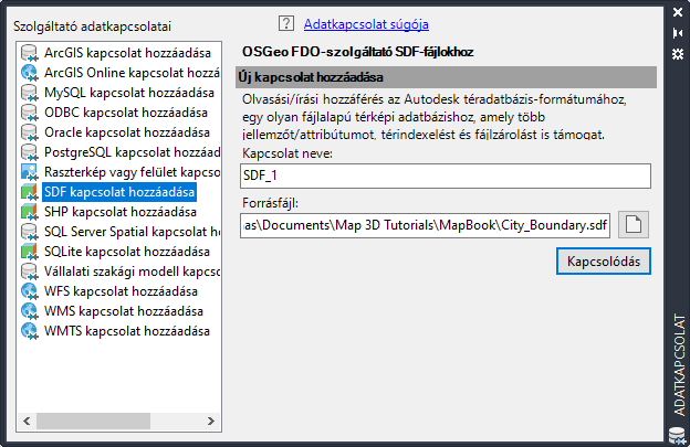 - A Forrásfájl területen (jobbra) kattintson a tallózás gombra, és keresse meg a minta City_Boundary.sdf fájlt. Kattintson a Kapcsolódás gombra.