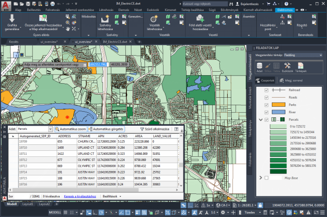 Ezen a térképen külön Megjelenítéskezelő-fólián szerepelnek a vasutak, utak, parkok, folyók és telkek. Mindegyik különböző módon van stilizálva. Az AutoCAD Map 3D eszközkészlet ablak elemeivel való megismerkedéshez lásd 2. lecke: AutoCAD Map 3D eszközkészlet.