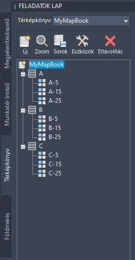 A térképkönyv létrehozásakor a szelvények a Feladatok lapon szerepelnek, és egy elrendezés lap jelenik meg mindegyik szelvényhez.