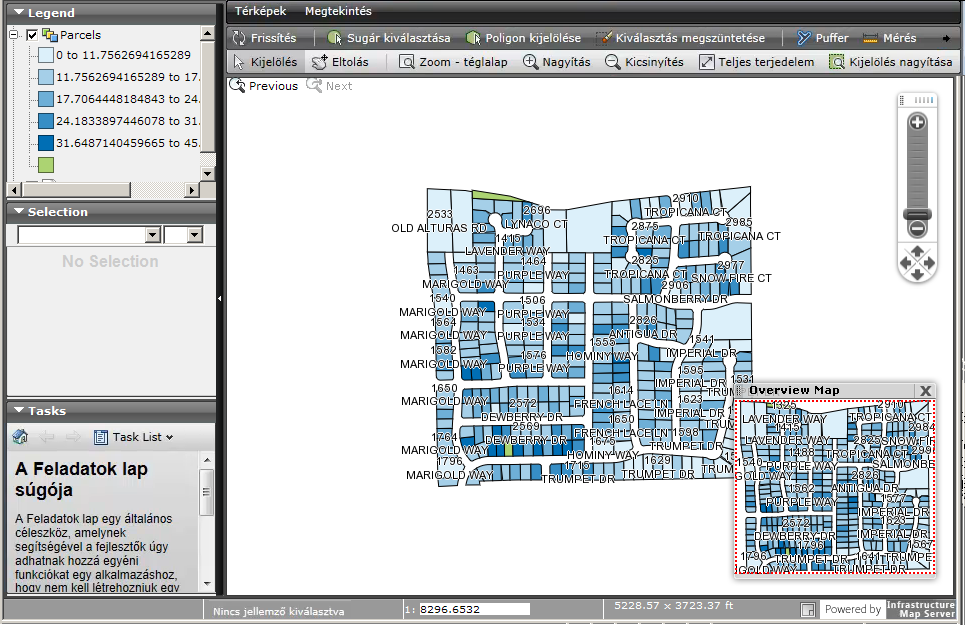 Ez a térkép egy fénykép raszterképet, SHP-fájlban tárolt épületinformációkat és DWG-fájlban tárolt telekadatokat tartalmaz.