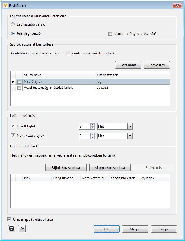 Megadhatja, hogy mely, a Vault által automatikusan nem kezelt fájltípusok törlődjenek a munkaterületről. A munkamappában található bármely fájl, ami megfelel a megadott kiterjesztéseknek törlődik a szinkronizálás során. Alapértelmezés szerint két szűrő van kikapcsolva: Naplófájlok (.log) és az ACAD biztonsági másolat fájlok (.bak, ac$).