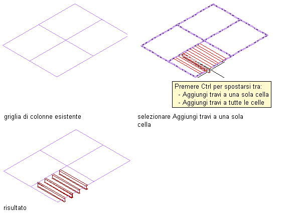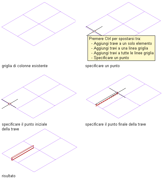Aggiungere una trave lungo uno o più segmenti di una griglia di colonne (se Tipo di layout è impostato su Bordo) Spostare il cursore su un segmento della griglia per visualizzare un'anteprima della trave, quindi fare clic per aggiungere una trave lungo tale segmento. In alternativa, premere CTRL e fare clic per aggiungere travi lungo tutti i segmenti della linea griglia corrente oppure premere due volte CTRL e fare clic per aggiungere travi lungo tutti i segmenti della griglia. Premere INVIO per terminare il comando.