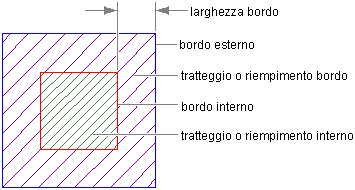 Riempimento bordo | Componente riempimento della parte esterna del poligono AEC. Questo componente viene visualizzato soltanto nelle viste renderizzate. Verificare che per ogni vista renderizzata si utilizzino i componenti Riempimento interno e Riempimento bordo della rappresentazione di visualizzazione Modello oppure della rappresentazione di visualizzazione 16,8 milioni di colori. In caso di utilizzo simultaneo di entrambe le rappresentazioni, i riempimenti vengono disegnati uno sopra l'altro. Nota: Quando le quote del bordo vengono impostate a 0, il riempimento del bordo non viene visualizzato in un poligono AEC renderizzato.