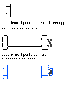 Utilizzare questa procedura per inserire componenti bullone quando occorre specificare la distanza tra la testa del bullone e il dado. In questo esempio, lo strumento utilizzato per l'inserimento del bullone presenta la proprietà Vista impostata su Laterale. Se l'impostazione selezionata è Dado o Testa, i primi due passaggi non sono richiesti.