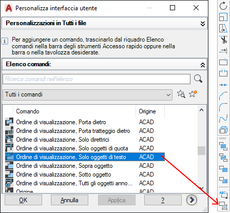 - Nel riquadro Elenco comandi, trascinare il comando da aggiungere alla barra degli strumenti nel riquadro Personalizzazioni in <nome file>.