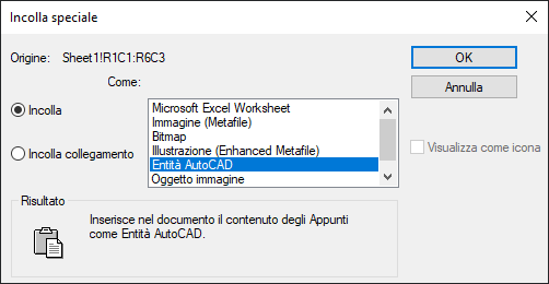 Sono disponibili diverse opzioni per incollare le informazioni in AutoCAD. Queste opzioni cambiano a seconda dell'applicazione di origine. Potrebbe essere necessario eseguire un piccolo test per vedere qual è l'opzione più adatta.
