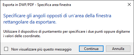 4. Nella finestra di messaggio Esporta in DWF/PDF - Specifica area finestra, fare clic su Continua per selezionare l'area.