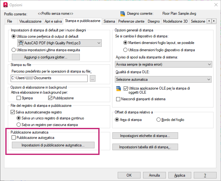 2. Nella finestra di dialogo Opzioni, fare clic sulla scheda Stampa e pubblicazione e attivare Pubblicazione automatica se non è già impostata.