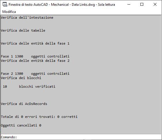 Se si desidera visualizzare il rapporto di riepilogo dettagliato della verifica, premere CTRL+F2 per aprire la finestra di testo di AutoCAD o premere F2 per espandere la finestra Riga di comando.