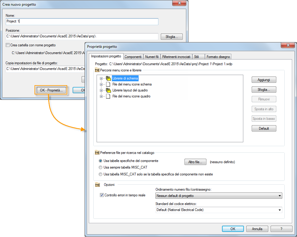 Definire le proprietà del progetto, come i percorsi delle librerie, il formato del disegno e lo stile di riferimento, quando si inizia un nuovo progetto o in un momento successivo.