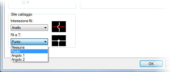 Quando un filo termina in corrispondenza di un altro filo formando una connessione a T, viene aggiunto un punto o una marcatura angolare a T, come definito nella scheda Stili della finestra di dialogo Proprietà disegno.